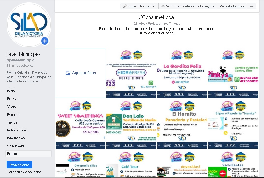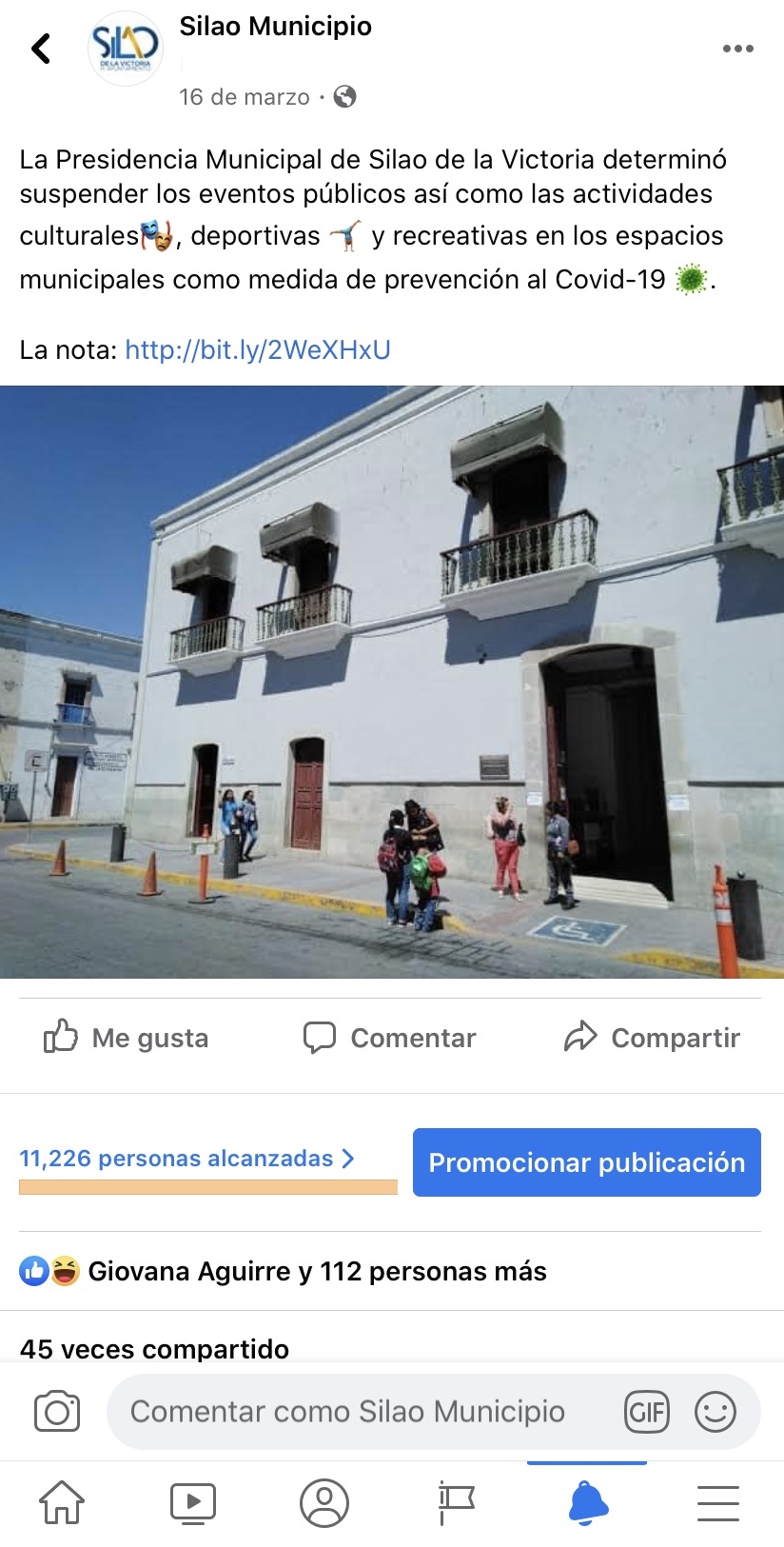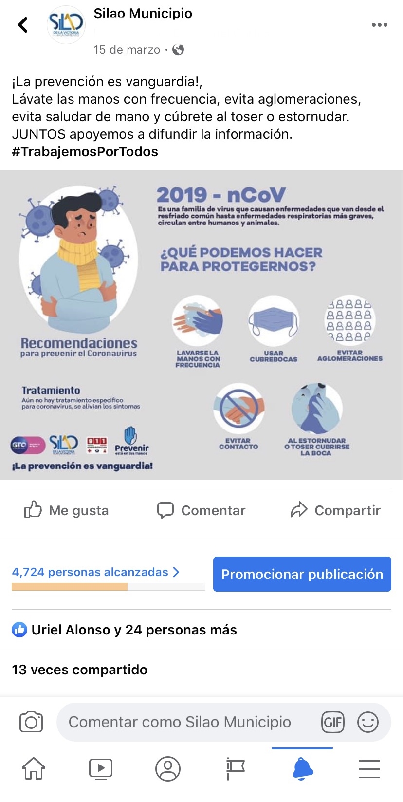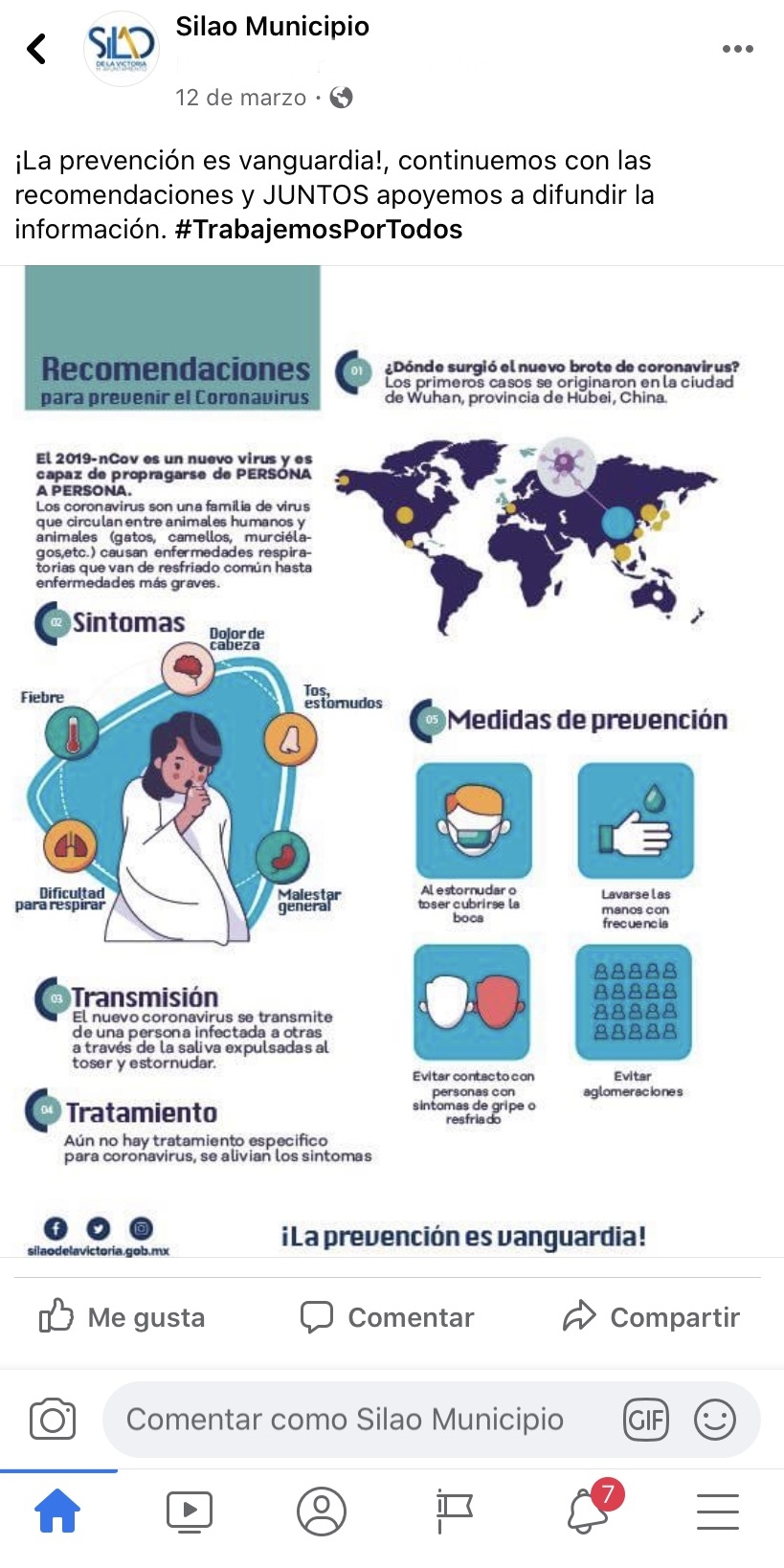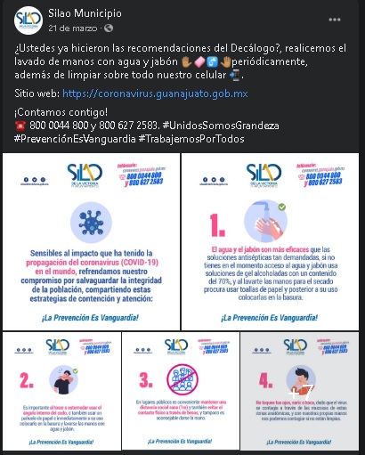 Ante esta situación Gobierno Municipal puso a disposición la página Facebook de Silao Municipio como apoyo de los comerciantes locales para promocionar sus servicios mediante entrega a domicilio.
