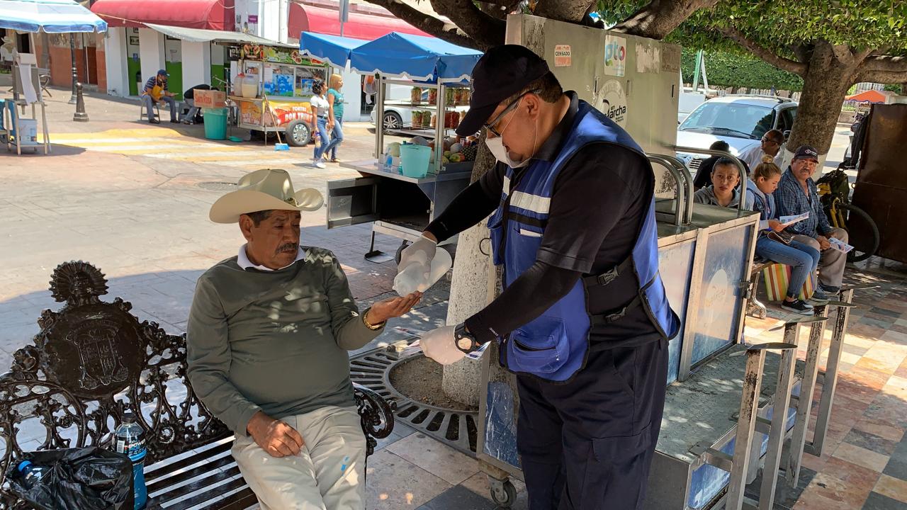 Personal de seguridad y otras dependencias brindaron información y gel con alcohol a la ciudadanía en el primer cuadro de la ciudad, negocios y a trabajadores ambulantes.