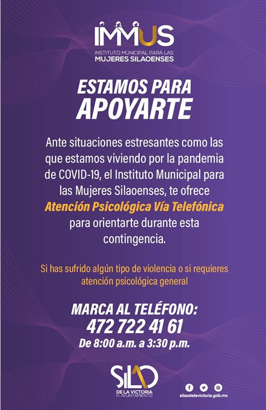Para apoyar la salud se fomentó el cuidado psicológico y emocional de cómo enfrentar la crisis sanitaria y el aislamiento en casa por la cuarentena con apoyo de DIF municipal y el Instituto Municipal de las Mujeres Silaoenses (IMMUS).